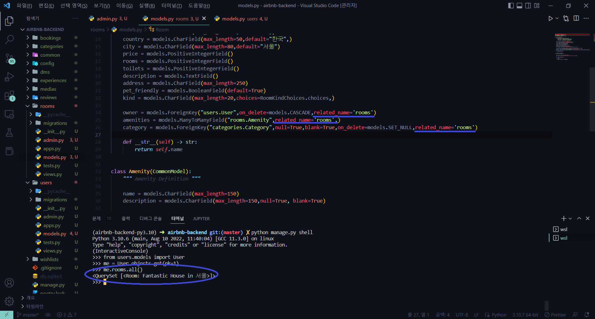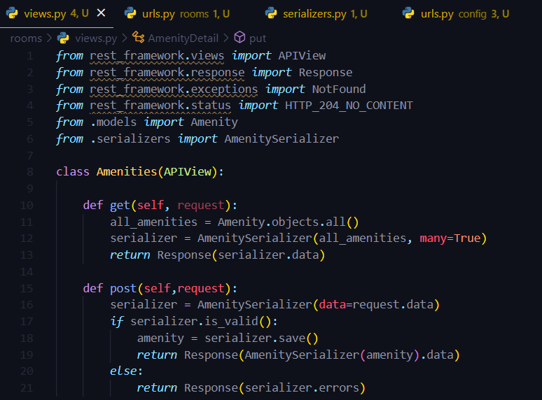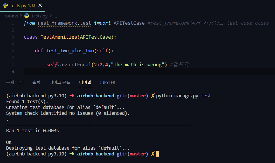 API Testing: 우리 코드에서 발생할 수 있는 모든 케이스를 작성해놓고 명령어 하나로 테스트하는 것이다. 그 명령어인 'python manage.py test'를 입력하면, 파이썬은 내가 작성한 모든 테스트를 실행한다. APITestCase class 안에 있는 테스트 메소드 명명 규칙: 만약 django가 내 코드를 테스트해주기를 바란다면, 그 테스트 코드는 반드시 'test_'로 시작하는 메소드 안에 작성되어야 한다. 'self.client...'는 우리의 API로 get/post/put/delete request 등을 보낼 수 있게 해준다. 'python manage.py test'는 우리가 만들어둔 DB에서 일어나는게 아니라 새로운 DB를 만들어서 실행하고 테스트가 끝나면 새로 만들어진 D..
