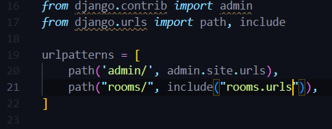 Views config 폴더의 'urls.py' : 유저가 특정 url로 접근했을 때, 장고가 해야할 행동에 대해 적혀있다. 각 App 폴더마다 있는 'views.py'는 직접 import해야 사용할 수 있다. 그래서 꼭 이름이 views.py일 필요는 없다. 이를 직접 import하는 방법은 두가지다. ①urls.py에 적어주기 views.py에 함수 작성 # views.py from django.http import HttpResponse def say_hello(request): return HttpResponse('Hello!') -> urls.py에 path 적어주기 # urls.py from room.views import say_hello urlpatterns = [path("rooms",s..